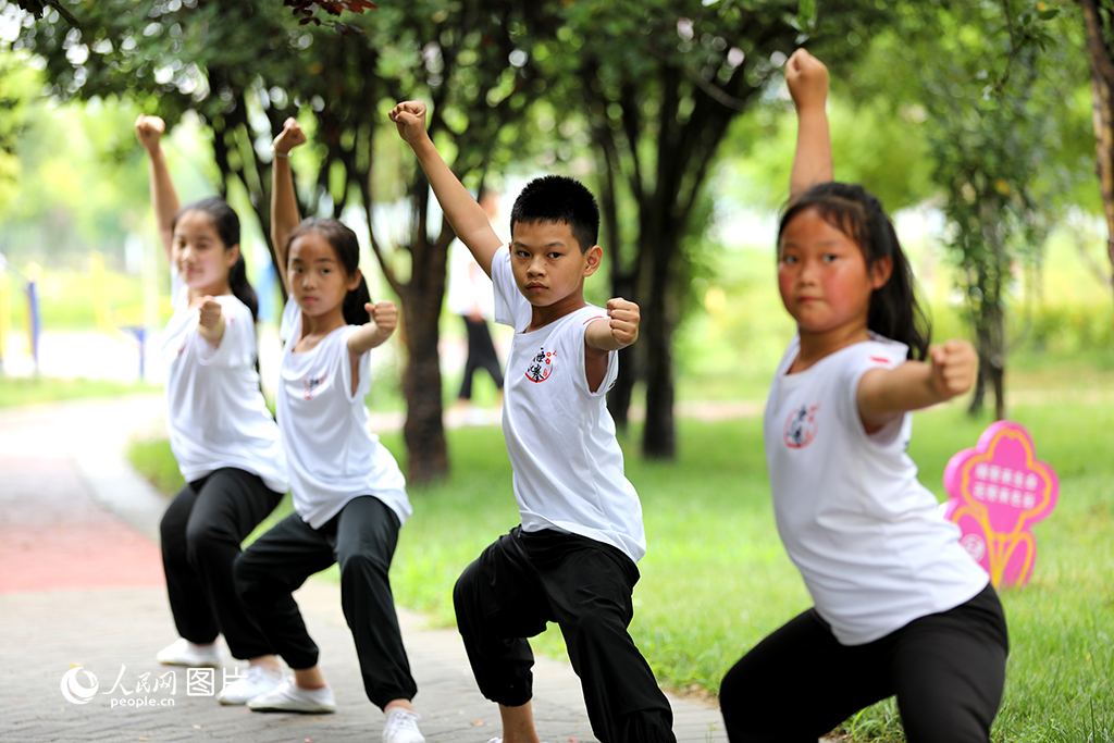 2020年8月5日,河北省邢臺市平鄉(xiāng)縣的孩子們在公園練習(xí)梅花拳。近日,河北省邢臺市平鄉(xiāng)縣總工會,縣文廣旅體局發(fā)揮各自優(yōu)勢,充分利用社區(qū)公園、健身廣場、健身步道等全民健身場地,鼓勵人民群眾在疫情常態(tài)化防控期間,積極鍛煉身體,共抗疫情,讓群眾感受到濃厚的“全民健身日”氛圍。范欽龍/攝