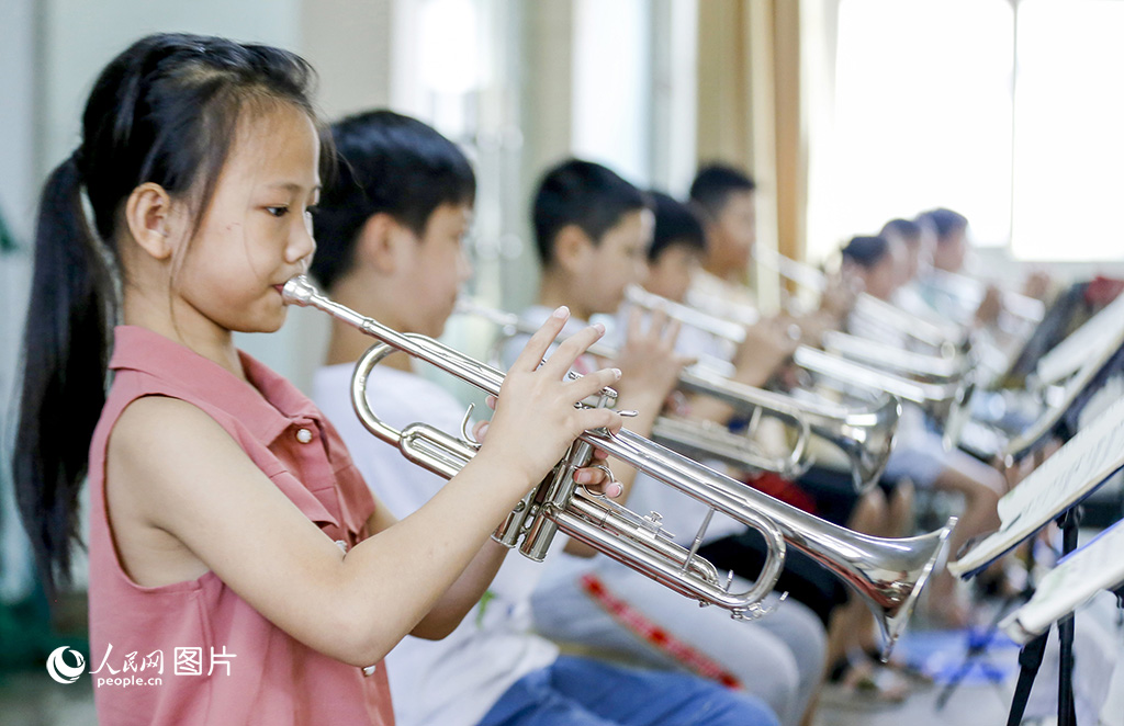 四川華鎣市雙河小學(xué)致力于學(xué)生的涵養(yǎng)教育和藝術(shù)熏陶, 豐富暑假生活, 專門創(chuàng)建了小學(xué)生軍樂團, 由專業(yè)老師義務(wù)指導(dǎo)練習(xí)。目前,軍樂團成員已有54名,樂器種類達8種。邱海鷹/攝
