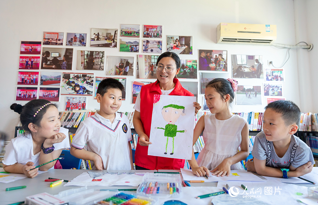 2020年8月4日,在江蘇省泰州市海陵區(qū)蘇陳鎮(zhèn)宣傳文化中心,志愿者陪伴留守兒童開展“讀一本好書”活動。