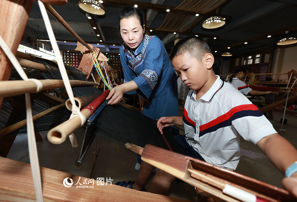 暑假期間,湖南省張家界市武陵源區(qū)開設(shè)學(xué)生“非遺課堂”,將國家級非物質(zhì)文化遺產(chǎn)項目土家族織錦拓展為學(xué)生暑期夏令營活動的實踐內(nèi)容,讓學(xué)生們在邊學(xué)邊玩中感受非物質(zhì)文化遺產(chǎn)魅力,豐富假期生活。吳勇兵/攝