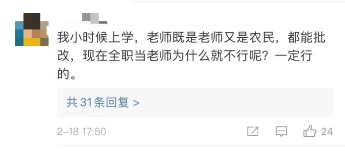 “我小時候上學(xué),老師既是老師又是農(nóng)民,都能批改,現(xiàn)在全職當(dāng)老師為什么就不行呢?”