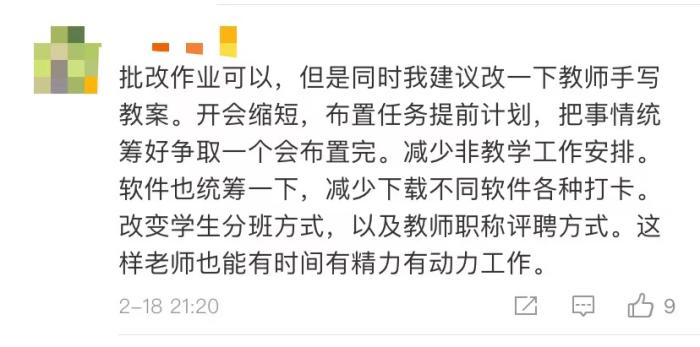 “批改作業(yè)可以,但是同時我建議一下教師手寫教案,開會縮短,減少非教學(xué)安排……”