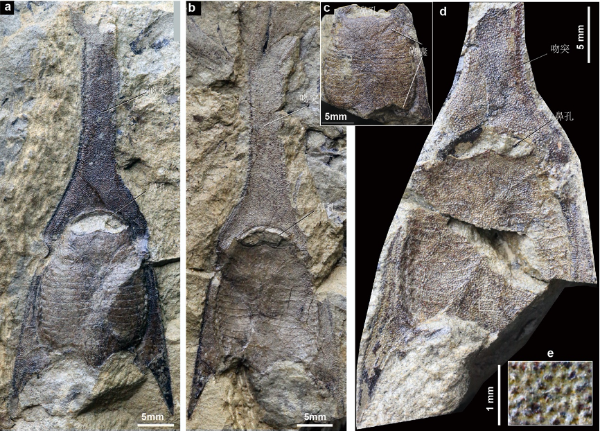 論文第一作者、中科院古脊椎所副研究員蓋志琨介紹,長吻三歧魚是一種約10厘米長的小魚,前面吻突最長可達(dá)5厘米。這種魚在分類上屬于無頜類盔甲魚亞綱三歧魚科,其頭甲形狀形似古代兵器三叉戟。目前三歧魚科僅有1屬3個種,分別是長吻三歧魚、昭通三歧魚和越南三歧魚,堪稱三歧魚三兄弟。