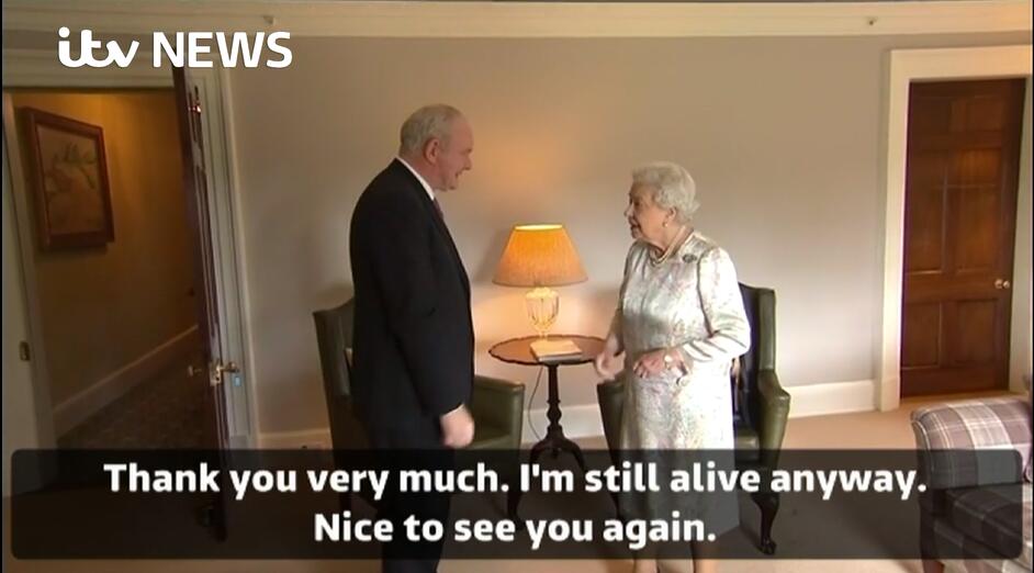 而女王和麥金尼斯會面時間達20分鐘,剛到達會面處,麥金尼斯便伸出手問候女王:“哈啰,您好嗎?”