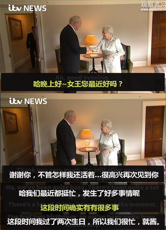 女王握了握他的手,幽默答復道,“十分感謝你,起碼還活著”,“我們這段時間十分忙?!?/p>