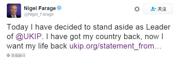法拉奇在個(gè)人推特上表示辭去獨(dú)立黨領(lǐng)袖職位,“我已經(jīng)找回我的國(guó)家,現(xiàn)在我要找回我自己的生活”
