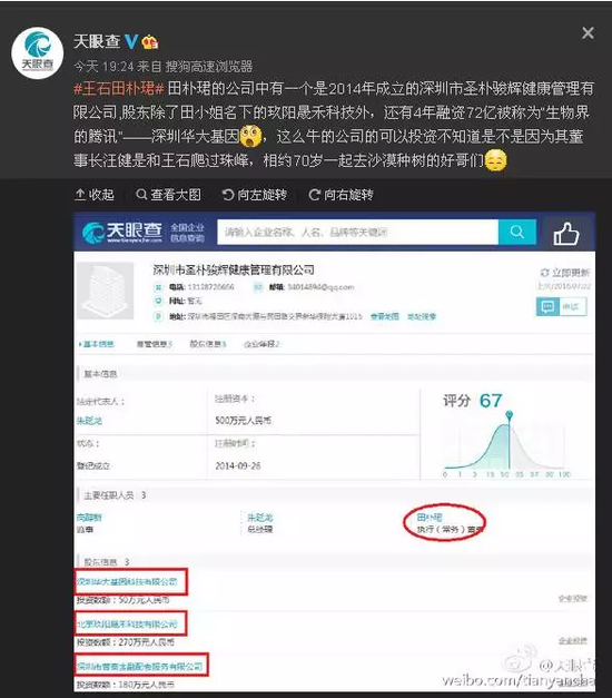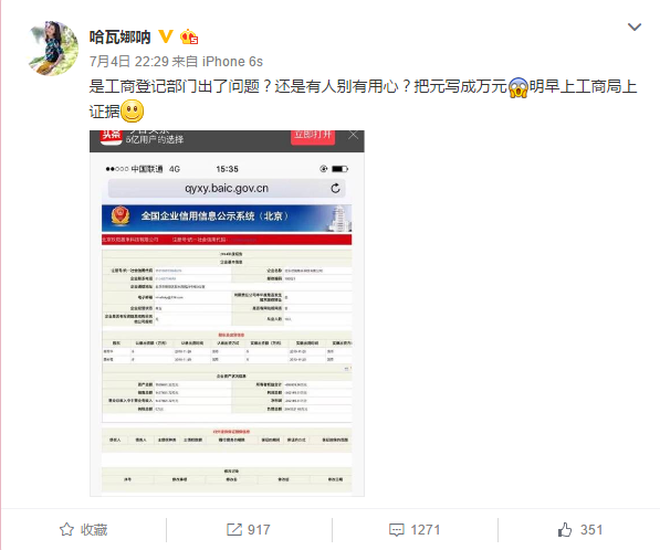 北京時間4日晚22點時許,田樸珺分別在個人微博和微信朋友圈發(fā)簡短澄清說明,懷疑信息系統(tǒng)有誤,表示將在明早(北京時間5日)去工商局上證據。多位田樸珺好友在其朋友圈留言關切。