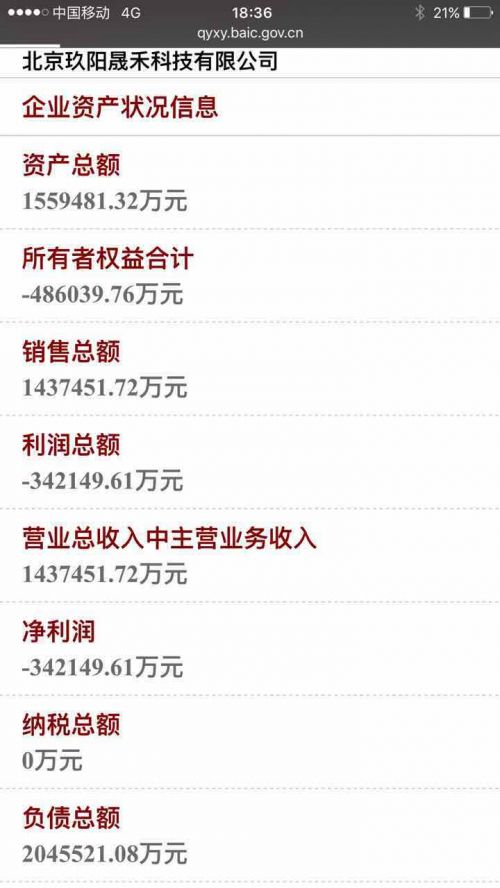 2014年年報顯示,北京玖陽晟禾科技有限公司的總資產大幅減少至156億元,負債總額也減少至205億元,所有者權益為-49億元。當年該公司銷售總額為144億元,凈利潤虧損34億元。