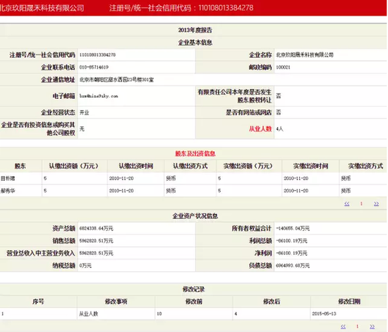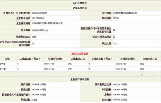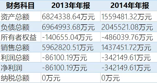 2013年年報顯示,注冊資本只有10萬元的北京玖陽晟禾科技有限公司資產總額高達682億元,但負債也高達696億元,這導致其股東權益變成-14億元;2013年其銷售總額為596億元,凈利潤虧損8.6億元。需要注意的是,其工商資料登記的從業(yè)人數(shù)只有10人,后修改至4人。