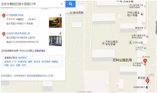 北京玖陽晟禾科技有限公司在工商局登記的住所為:北京市朝陽區(qū)甜水西園23號樓3層302。在百度地圖搜索“北京市朝陽區(qū)甜水西園23號”,得到的搜索結果如下截圖所示: