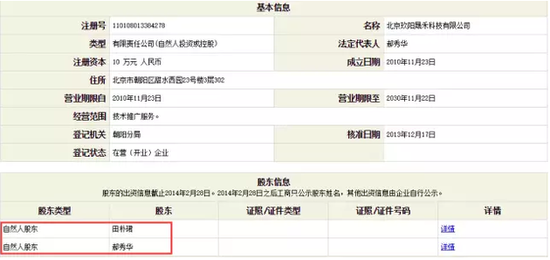 工商資料顯示,北京玖陽晟禾科技有限公司成立于2010年11月23日,注冊資本10萬元。該公司有兩位股東,田樸珺和郝秀華,兩人出資額均為5萬元。