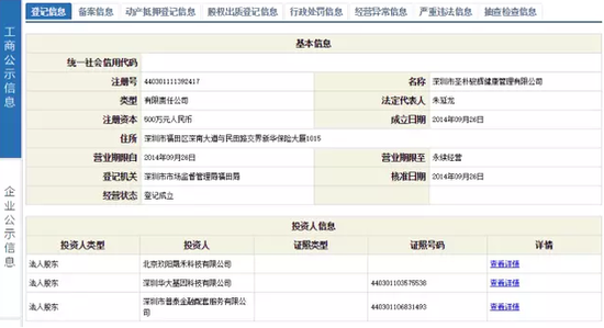 深圳市圣樸駿輝健康管理有限公司注冊資本500萬,其中北京玖陽晟禾科技有限公司出資270萬,深圳華大基因科技有限公司出資50萬。