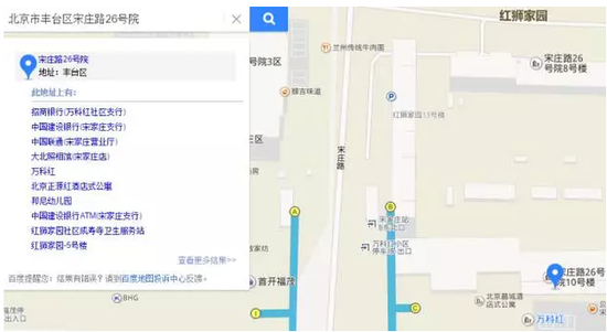 該公司住所為:北京市豐臺區(qū)宋莊路26號院11號樓15曾1510.在百度地圖輸入“北京市豐臺區(qū)宋莊路26號院”后,得到的搜索結果如下圖示: