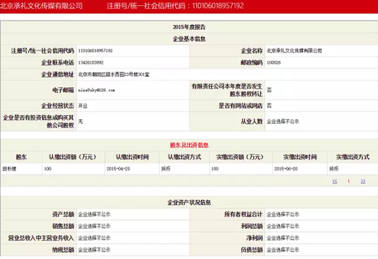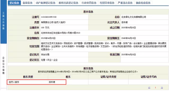 工商登記資料顯示,北京承禮文化傳媒有限公司成立于2015年4月20日,注冊資本100萬元,出資人為田樸珺一人,法定代表也為田樸珺。
