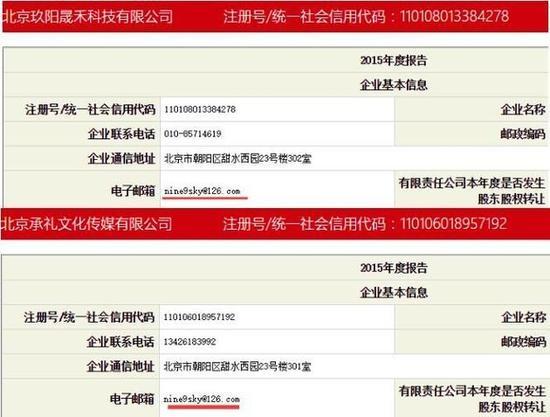 在工商顯示系統(tǒng),北京承禮文化傳媒有限公司和北京玖陽晟禾科技有限公司的電子郵箱地址均為nine9sky@126.com。