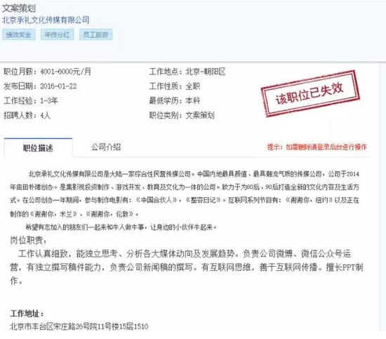在智聯(lián)招聘網站上,還有一則有關北京承禮文化傳媒有限公司的招聘信息,該信息發(fā)布于2016年01月22日,目前已失效。據該招聘信息披露:北京承禮文化傳媒有限公司于2014年由田樸珺創(chuàng)辦,工作地址:北京市豐臺區(qū)宋莊路26號院11號樓15層1510。