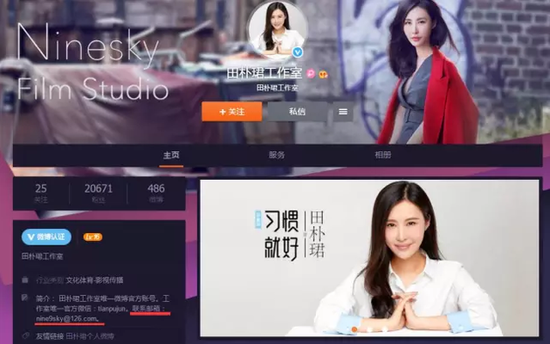 而在“田樸珺工作室”的新浪認證微博上,其留下的聯(lián)系郵箱也為nine9sky@126.com。