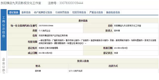 東陽橫店九天云影視文化工作室成立于2013年10月29日,系田樸珺的個人獨資公司。