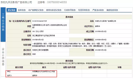 該公司成立于2015年6月10日,注冊資本300萬,法定代表人郝秀華,股東有兩位:東陽橫店九天云影視文化工作室(即上文的公司3)和郝秀華,兩者分別出資180萬、120萬。