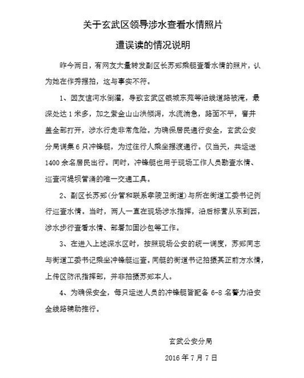 這兩天,南京玄武區(qū)副區(qū)長(zhǎng)蘇鄭視察水情的照片遭網(wǎng)友質(zhì)疑。7日晚上8點(diǎn)半左右,南京玄武公安分局官方微博對(duì)此事作出回應(yīng),發(fā)布《關(guān)于玄武區(qū)領(lǐng)導(dǎo)涉水查看水情照片遭誤讀的情況說明》一文稱:“昨今兩日,有網(wǎng)友大量轉(zhuǎn)發(fā)副區(qū)長(zhǎng)蘇鄭乘艇查看水情的照片,認(rèn)為她在作秀擺拍,這與事實(shí)不符”,并配發(fā)武警幫助行人乘坐沖鋒艇擺渡通行的現(xiàn)場(chǎng)圖片。