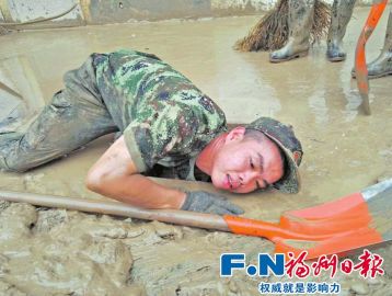 10日下午14時,部隊到達永泰受災最嚴重的清涼鎮(zhèn)。原本干凈繁華的鎮(zhèn)區(qū)此刻到處是垮塌的房屋、折斷的樹枝和厚厚的淤泥,多處道路被泥石流堵塞。冒著瓢潑大雨,李益民第一個跳下車,來不及整理行裝就投入到救援搶險中。經(jīng)過6個小時的戰(zhàn)斗,李益民與戰(zhàn)友成功疏通了永泰城關到清涼鎮(zhèn)的必經(jīng)通道,直到晚上8點多才返回駐地。