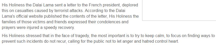 達賴喇嘛7月18日致函法國總統(tǒng)奧朗德,表示面對慘劇時,最重要的是努力保持平靜,呼吁法國大眾“不要讓憤怒與仇恨控制內心”。有評論指出,達賴言論疑似為恐怖勢力求情。