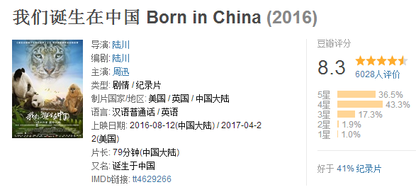 影片從2014年起橫跨春夏秋冬四季拍攝,以三個(gè)中國(guó)獨(dú)有的野生動(dòng)物—— 大熊貓、三江源雪豹、川金絲猴為主線,呈現(xiàn)了臥龍、神農(nóng)架、可可西里、羌塘、三江源等多個(gè)自然保護(hù)區(qū)的生態(tài)風(fēng)貌。豆瓣評(píng)分還不錯(cuò),8.3分。
