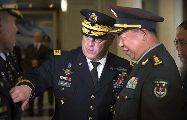 8月16日下午,中國人民解放軍陸軍司令員李作成上將在八一大樓與來訪的美國陸軍參謀長馬克·米萊上將舉行了會談,雙方談及南海和“薩德”等多項議題。