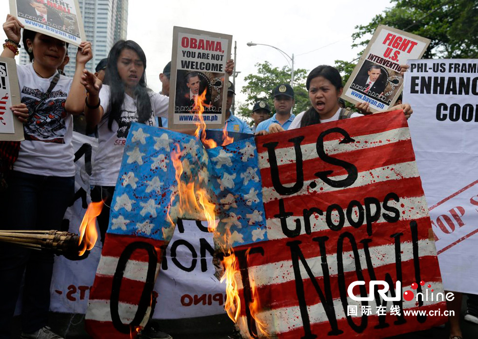 菲律賓馬尼拉部分學(xué)生在美國(guó)使館附近舉行反美示威,抗議美國(guó)在菲律賓的軍事存在,反對(duì)美菲兩國(guó)就擴(kuò)大國(guó)防合作簽訂協(xié)定