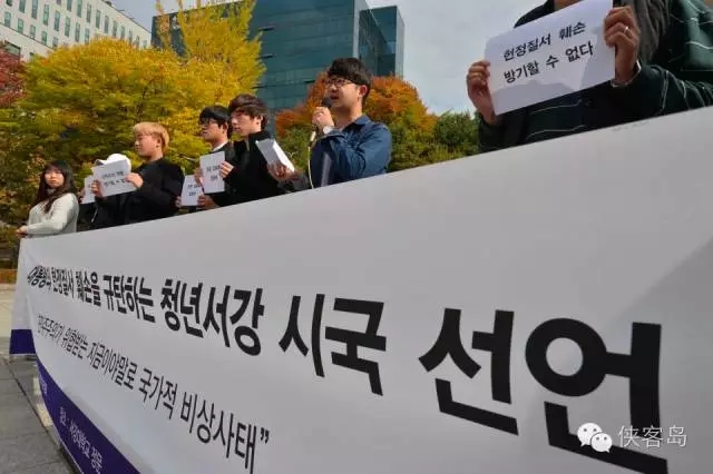 截至10月29日,已有四十多所大學(xué)的學(xué)生在學(xué)校貼出大字報(bào),并發(fā)表“時(shí)局宣言”,聲討樸槿惠和崔順實(shí)。韓國外國語大學(xué)別出心裁地貼出了10種語言的宣傳口號(這是要讓全世界人民都“評評理”啊),秉承儒家理念的成均館大學(xué)的學(xué)生則穿著儒生服打出了“見義不為,無勇也”的木牌。多所大學(xué)的教授團(tuán)體也陸續(xù)發(fā)表宣言,呼吁樸槿惠下臺、成立中立內(nèi)閣。韓國網(wǎng)上還出現(xiàn)了一份《五十國韓僑敦促樸總統(tǒng)下臺書》,表示“總統(tǒng)成為個人的傀儡,這個事實(shí)已經(jīng)滿天下皆知了;這是把國家打入深淵的重大犯罪和國家恥辱”。