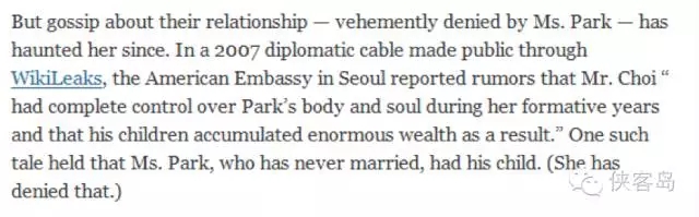 《紐約時(shí)報(bào)》 10月27日的一篇報(bào)道——記者是韓國人,據(jù)說是第二位獲得普利策新聞獎的韓國人——說,1979年槍殺樸正熙的中央情報(bào)部部長金載圭在一次法庭陳述時(shí)說,他之所以射殺樸正熙,其中一個原因就是樸正熙未能阻止崔太敏的非法牟利活動,未能讓崔太敏遠(yuǎn)離自己的女兒。該報(bào)道繼續(xù)說“有關(guān)樸槿惠崔太敏關(guān)系的傳聞——樸槿惠曾矢口否認(rèn)——一直困擾著她。維基解密公開的2007年的一份外交電報(bào)顯示,駐韓美國使館曾匯報(bào)說,崔太敏先生‘曾在樸槿惠的性格形成期徹底控制了她的身體和心靈,他的孩子們由此積累了巨額財(cái)富’。其中一個傳言說,一生未婚的樸槿惠與崔太敏之間育有一子(她否認(rèn)了此點(diǎn))”。