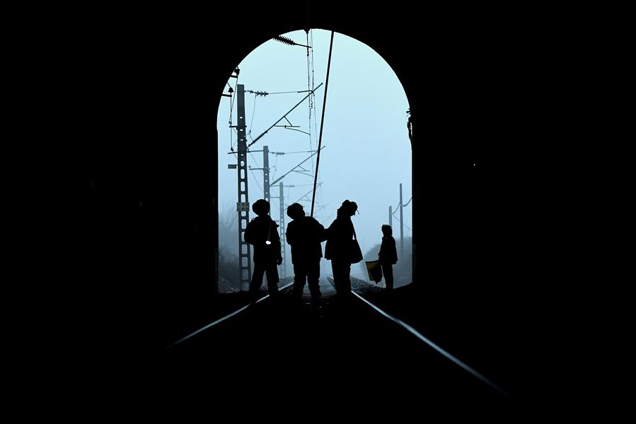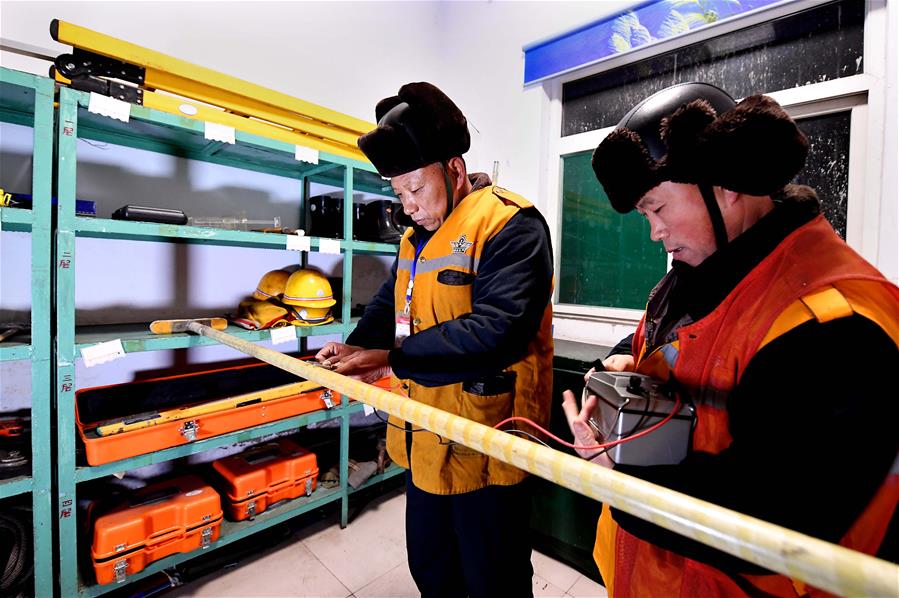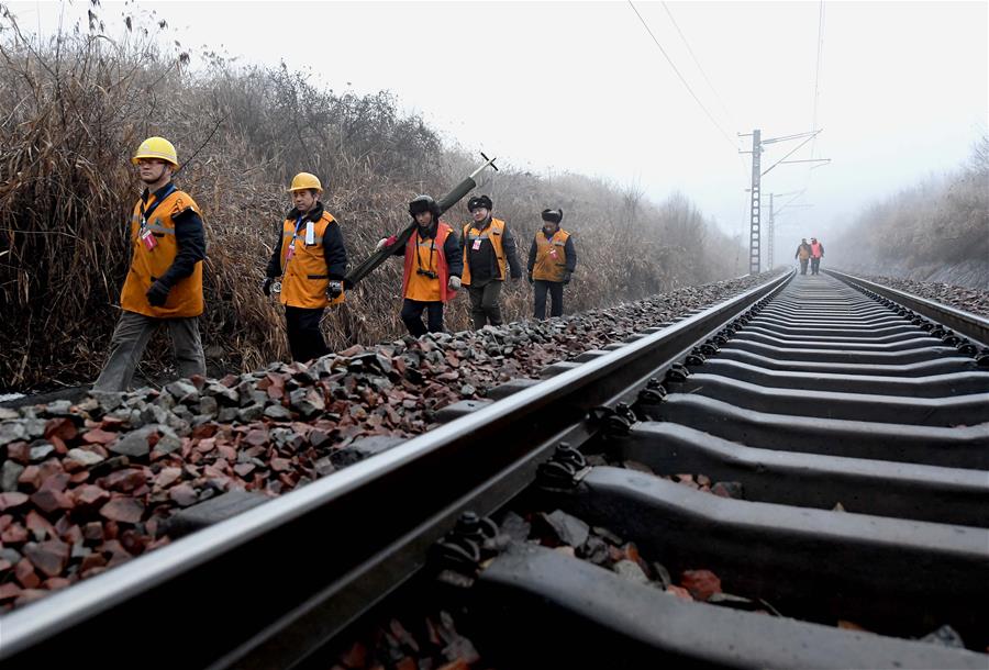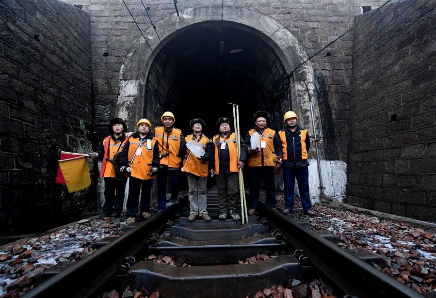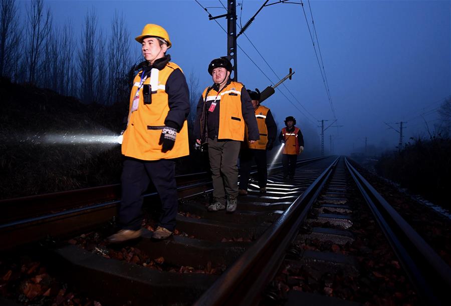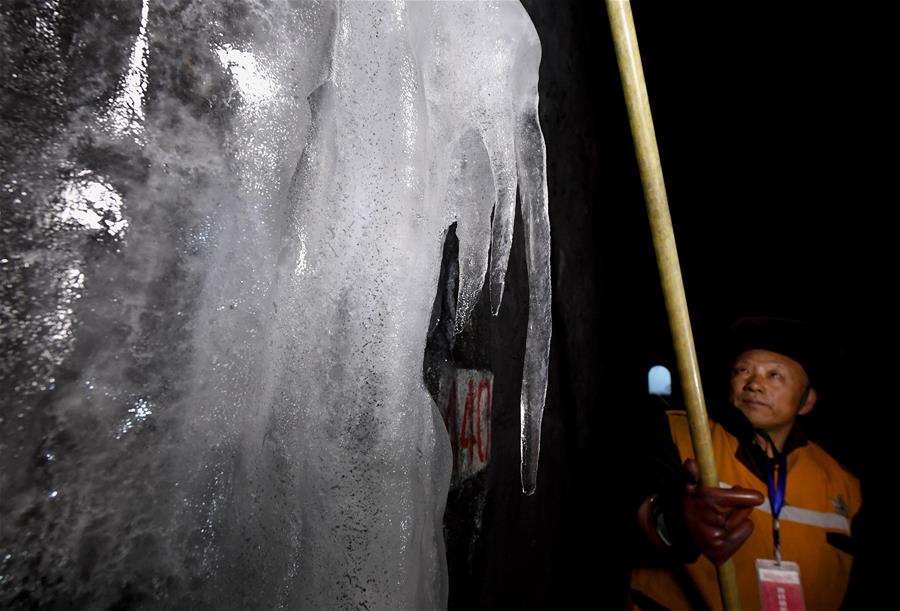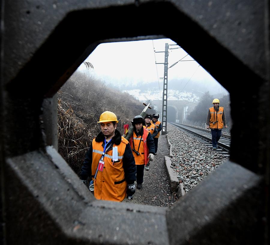 1月5日,鄭州鐵路局新鄉(xiāng)供電段東田良打冰點(diǎn)的工作人員沿鐵路步行至丹珠嶺隧道,準(zhǔn)備進(jìn)行打冰作業(yè)。