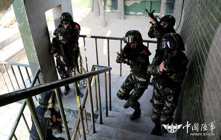 突擊小組正在進(jìn)行班組協(xié)同反恐訓(xùn)練