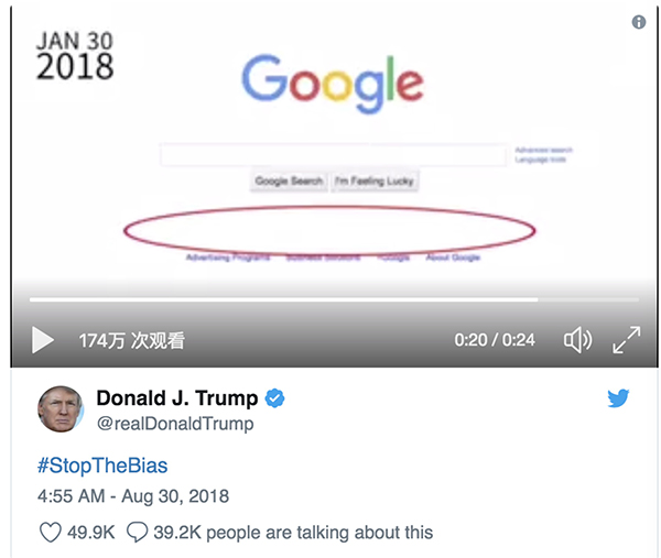 當(dāng)?shù)貢r間8月29日,特朗普通過美國社交平臺推特發(fā)布了一條視頻,視頻顯示美國前總統(tǒng)巴拉克·奧巴馬當(dāng)任期間,谷歌每年都會在其首頁上宣傳奧巴馬的國情咨文演講,卻沒有在2017年和2018年一樣宣傳特朗普的演講。特朗普為這條推特加上了#停止偏見#的標(biāo)簽,繼續(xù)指責(zé)谷歌的反保守主義傾向。