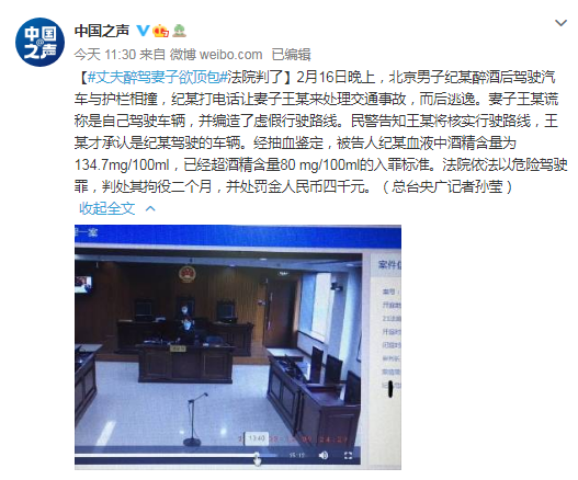 2月16日晚上,北京男子紀(jì)某醉酒后駕駛汽車與護(hù)欄相撞,紀(jì)某打電話讓妻子王某來處理交通事故,而后逃逸。妻子王某謊稱是自己駕駛車輛,并編造了虛假行駛路線。民警告知王某將核實行駛路線,王某才承認(rèn)是紀(jì)某駕駛的車輛。經(jīng)抽血鑒定,被告人紀(jì)某血液中酒精含量為134.7mg/100ml,已經(jīng)超酒精含量80 mg/100ml的入罪標(biāo)準(zhǔn)。法院依法以危險駕駛罪,判處其拘役二個月,并處罰金人民幣四千元。(總臺央廣記者孫瑩)