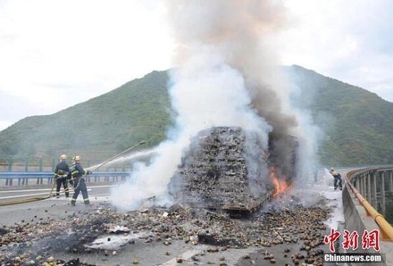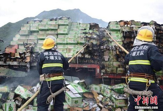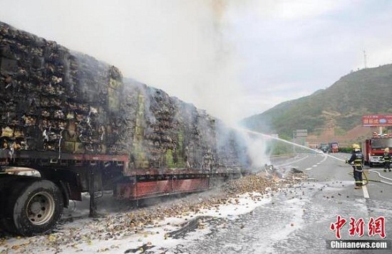 5月18日上午7時(shí)許,一輛載有30噸梨子的貨車在行至福銀高速十漫段鄖西縣上津鎮(zhèn)收費(fèi)站附近時(shí)突然起火。當(dāng)?shù)叵谰o急滅火,但因包裝梨子的紙箱助燃了火勢,30噸梨子全部燒毀,貨車也基本報(bào)廢?;馂?zāi)未造成人員傷亡。范時(shí)瑞 攝