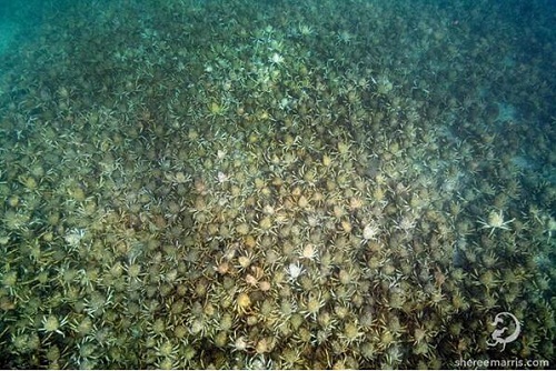 據(jù)英國(guó)《每日郵報(bào)》6月16日?qǐng)?bào)道,水生科學(xué)家希爾-馬里斯日前在墨爾本的菲利普港灣拍攝到了令人瞠目結(jié)舌的一幕。成千上萬(wàn)只蜘蛛蟹齊聚海底,開始了一年一度的大遷徙。