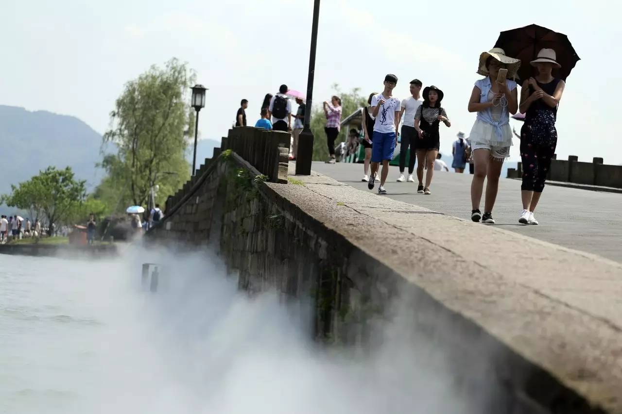 △昨天杭州迎來今年最高溫,達(dá)到35度。在西湖景區(qū)內(nèi),斷橋開啟了噴霧裝置,幫助游客降溫。