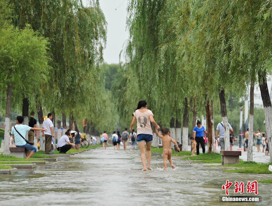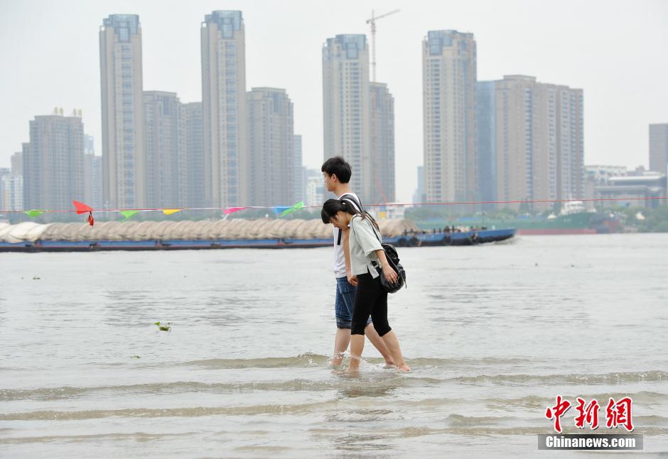 6月30日,武漢漢口江灘江水漫上親水平臺(tái)。不少市民挽起褲腳在水中漫步休閑。近日,長(zhǎng)江武漢段水位呈快速上漲趨勢(shì)。
