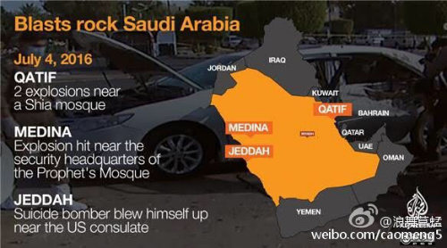 在齋月的最后一天,沙特遭到4起自殺性恐襲爆炸:先是美國駐沙特吉達(dá)總領(lǐng)事館遇襲,然后沙特東部蓋提夫的什葉派清真寺遭到兩起爆炸襲擊,最后,伊斯蘭圣城麥地那的先知穆罕穆德清真寺遭遇恐襲爆炸。