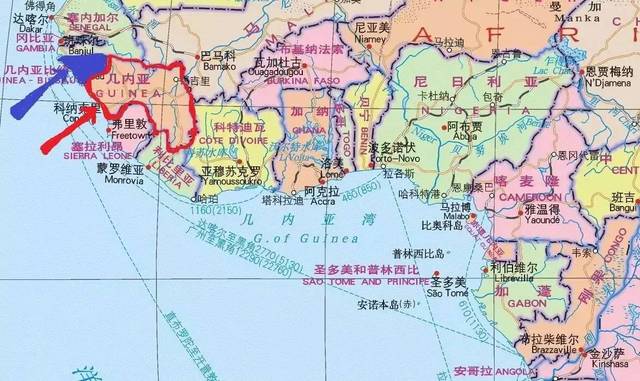 注意,幾內(nèi)亞比紹和幾內(nèi)亞不是一個(gè)地方哦。下圖中,紅色箭頭所指的是幾內(nèi)亞,而幾內(nèi)亞比紹則是藍(lán)色箭頭所示國家。