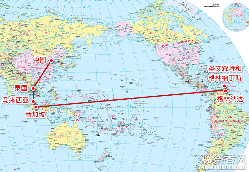 付耀波說,他們利用13天,輾轉(zhuǎn)了泰國、馬來西亞、新加坡、格林納達(dá),來到計(jì)劃中去往圣格的第一個(gè)島嶼,靠面包和水果撐了3天,等來了去圣格的客船,經(jīng)過6個(gè)小時(shí)的航程,終于到達(dá)了目的地。外逃路線如下圖: