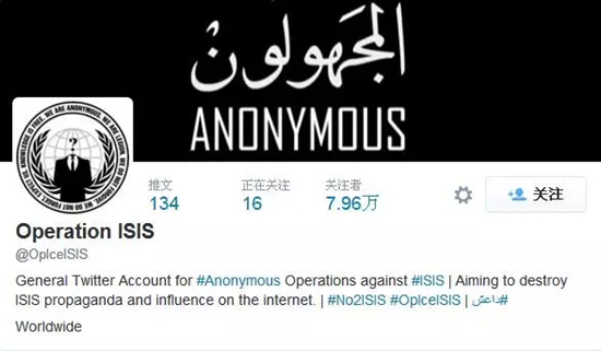 國際知名黑客組織“匿名者”(Anonymous)曾發(fā)起#OpISIS行動,攻陷了數(shù)百個ISIS的Twitter和Facebook帳號。去年巴黎恐襲發(fā)生后,匿名者又向ISIS全面宣戰(zhàn)?!拔覀儗⒐ハ菽銈兊木W(wǎng)站、帳號、E-mail,并將你們身份曝光。從現(xiàn)在開始網(wǎng)絡上不會再有你們的安身之處,你們會像病毒一樣被我們殺掉。”除了ISIS,匿名者的目標還有那些資助和支持ISIS的組織。