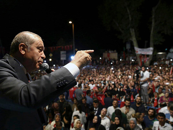 當(dāng)?shù)貢r間7月19日,土耳其伊斯坦布爾,民眾在土耳其總統(tǒng)埃爾多爾總統(tǒng)府邸前集會抗議政變,埃爾多安對示威人群發(fā)表講話。