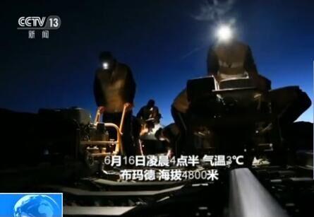 6月16日凌晨4點(diǎn)半,氣溫3攝氏度。在海拔4800米的布瑪?shù)?,新一天的換軌工作開(kāi)始了。青藏鐵路公司西寧工務(wù)機(jī)械段副段長(zhǎng)楊明告訴記者,新軌在軌道車的牽引當(dāng)中,落到盛軌槽里面,舊的經(jīng)過(guò)人工輔助,分離到兩邊的道床上。這樣就在這里完成了一個(gè)新軌和舊軌的交換。