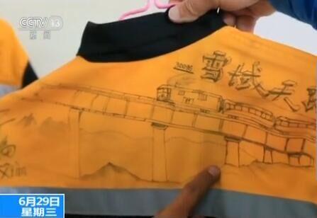 2012年,洛松主動(dòng)申請(qǐng),來(lái)到條件惡劣的海拔4800米的唐古拉線路車間,背著鎬頭行走在125公里的養(yǎng)護(hù)段里。洛松幾乎沒(méi)有繪畫(huà)基礎(chǔ),但是每天都行走在這條天路上,看到飛馳的火車,他萌生了把自己的工作場(chǎng)景畫(huà)在工裝上的念頭。