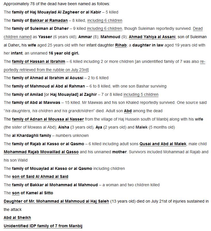 據(jù)外媒報(bào)道,7月19日,僅僅在敘利亞小城曼比季(Manbij)的一場(chǎng)戰(zhàn)斗中,美國(guó)領(lǐng)導(dǎo)的盟軍空襲行動(dòng)就炸死了至少56名敘利亞平民,甚至可能超過(guò)200人。如果報(bào)道屬實(shí),這將是盟軍空襲敘利亞和伊拉克以來(lái)導(dǎo)致平民傷亡最為慘重的一次行動(dòng)。就連美國(guó)支持的敘利亞反對(duì)派都呼吁美軍立即停止空襲。