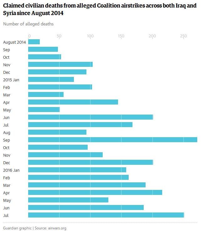 “空中戰(zhàn)爭(zhēng)跟蹤組織”統(tǒng)計(jì)的敘利亞和伊拉克每月死于盟軍空襲的平民人數(shù)