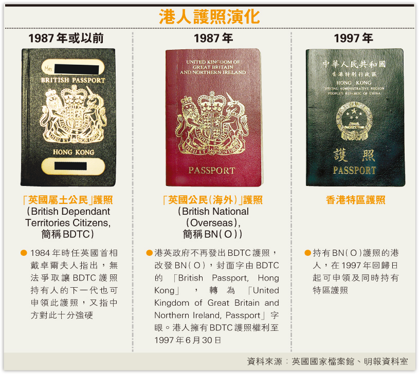 檔案顯示,英國政府決定從1987年7月1日起,向港人簽發(fā)沒有居英權(quán)的BN(O)護照,取代原有的BDTC護照,而港人擁有BDTC護照的權(quán)利至1997年6月30日失效。據(jù)悉,持BN(O)護照可免簽進入英國,在英國國外可享受英國領(lǐng)事幫助,但不具備在英居留權(quán)。