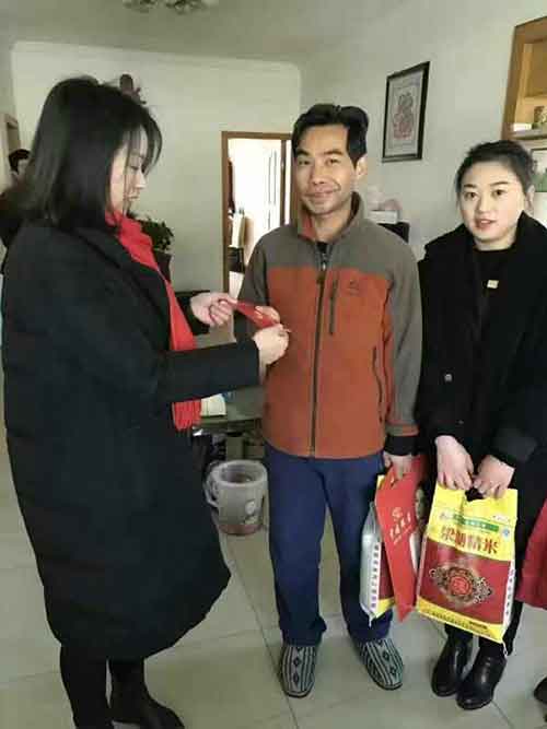 春節(jié)臨近,1月21日,鄂州市政協(xié)委員、小林珠寶總經(jīng)理林命強先生到吳都社區(qū)和濠塘社區(qū)看望慰問低保戶。當日,在社區(qū)工作人員的指引下,林命強先生帶領員工到王開勝,朱素娥等5戶困難群眾家中,開展春節(jié)慰問活動。給貧困戶、孤寡老人兒童送上新春祝福及節(jié)日的問候,并送上現(xiàn)金及慰問物品,共發(fā)放大米、食用油、對聯(lián)、紙杯等物質(zhì)50份,價值人民幣7000多元。